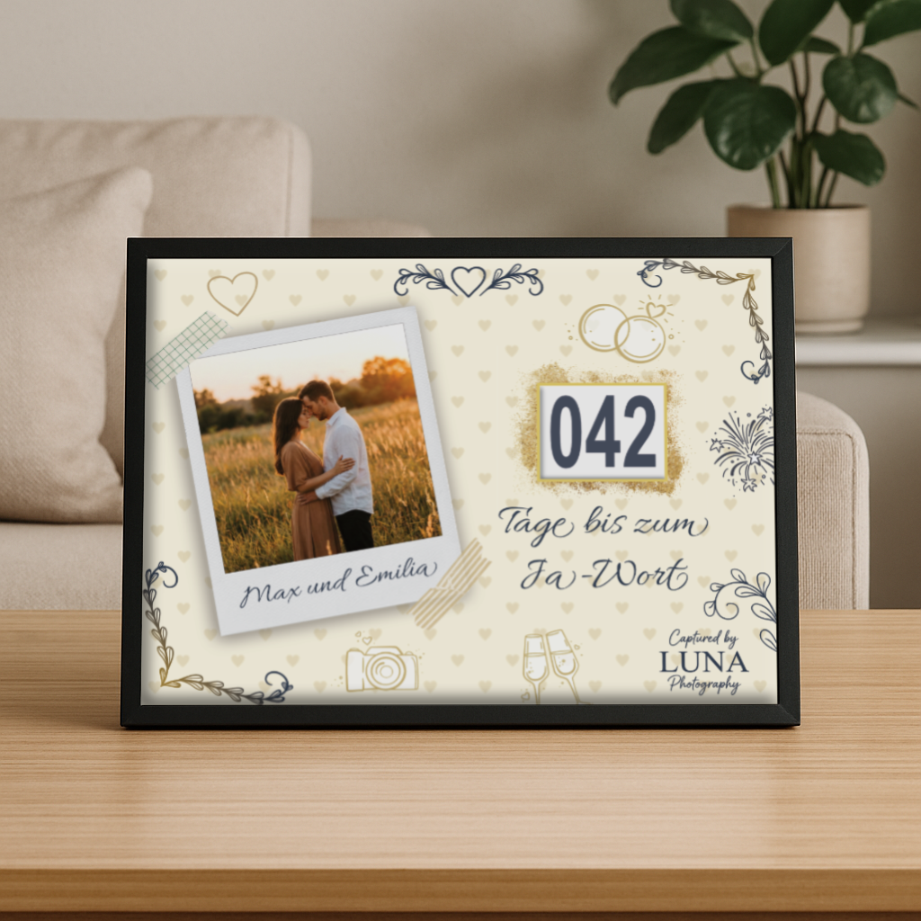Der Countdown schafft jeden Tag ein Moment der Vorfreude für das Brautpaar – und macht Ihre Hochzeitsplanung unvergesslich sichtbar.