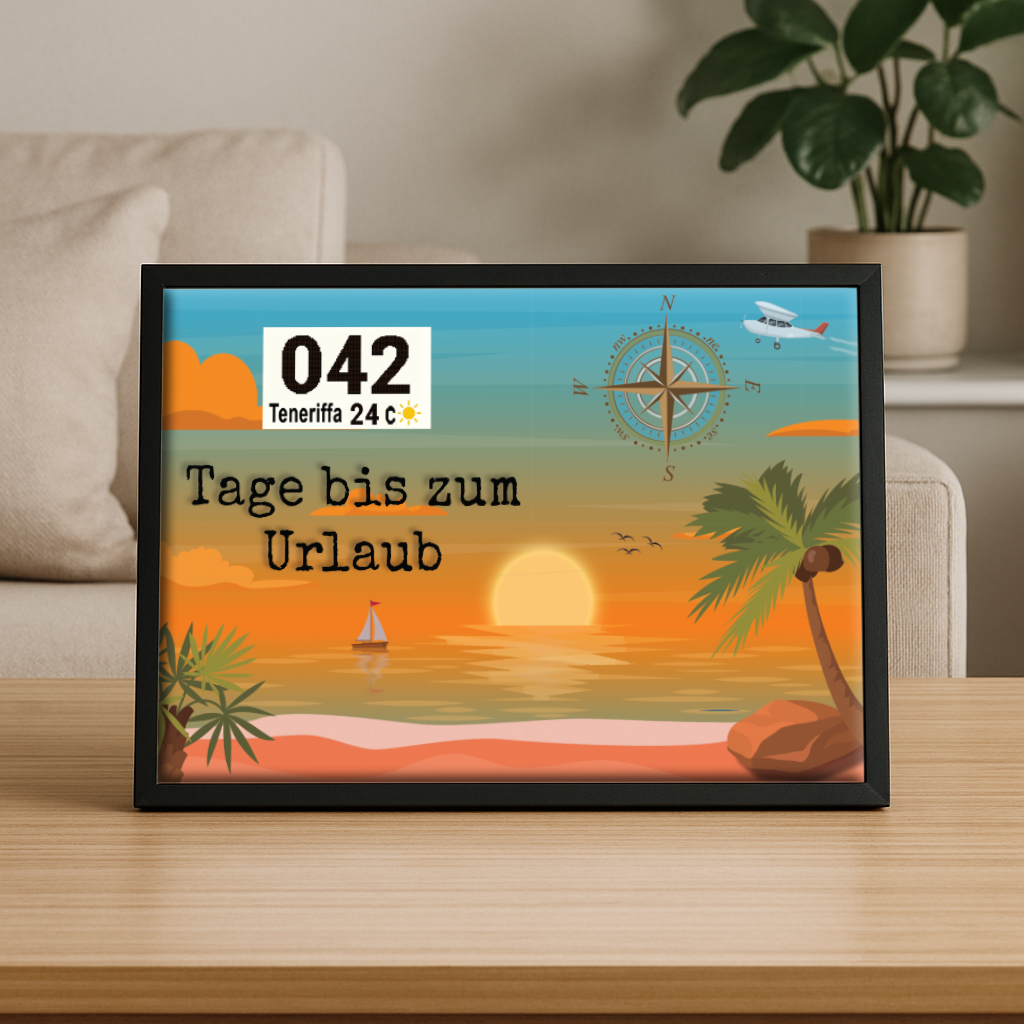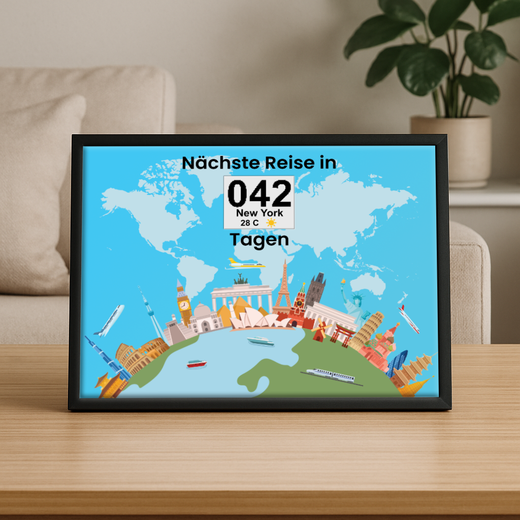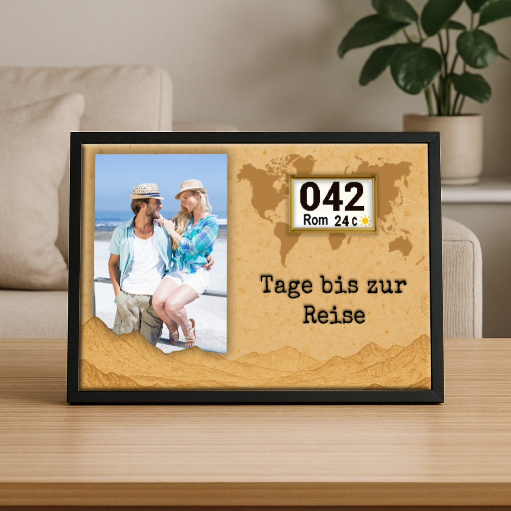 TravelFrame ist ein moderner, personalisierbarer Countdown-Bilderrahmen.